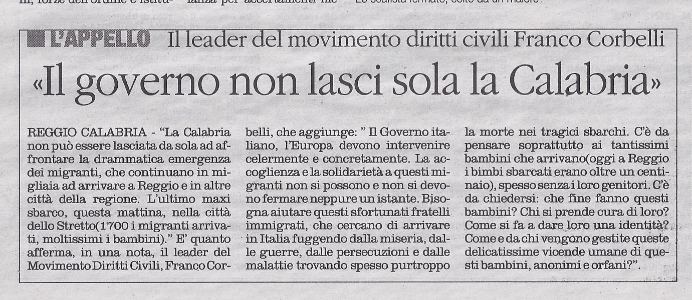 Il leader del Movimento Diritti Civili, Franco Corbelli, interviene sull’arrivo in Calabria, nei porti di Vibo e di Reggio, di due nuove navi della Marina Militare con altre migliaia di migranti, di diversi Paesi del mondo. “Quello che sta accadendo in queste ultime ore, la nave approdata a Vibo con oltre 800 migranti e il maxi sbarco previsto per il pomeriggio a Reggio, con altri 1800 migranti, è la conferma del ruolo centrale che la Calabria continua ad avere per affrontare il dramma dell’immigrazione. La Calabria continua ad essere assoluta e generosa protagonista dell’accoglienza ai poveri migranti del mondo. La Calabria non può per questo essere lasciata da sola, va adeguatamente supportata, dal Governo italiano e dall’Unione Europea, e premiata, come Diritti Civili, ha ufficialmente chiesto il 17 luglio scorso, al Comitato Organizzatore, che ha sede ad Oslo, con l’assegnazione del Premio Nobel per la Pace, unitamente alla Sicilia e all’operazione Mare Nostrum. Sarebbe una grande ingiustizia se il Premio Nobel per la Pace, che sarà comunicato tra pochi giorni (il 15 ottobre), non dovesse premiare lo straordinario e generosissimo sforzo del popolo calabrese, unitamente a quello siciliano e agli operatori di Mare Nostrum, che continuano ogni giorno a salvare decine di migliaia di migranti.